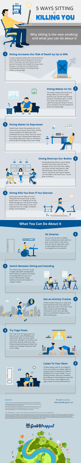 5 Ways Sitting is Killing You – Find out why sitting is the new smoking and what you can do about it for better health and wellness. GeekWrapped.com’s science team has summarized the top five reasons why sitting is unhealthy. It increases our chance of dying early, makes us fat, increases the risk of depression, harms our bodies, and is detrimental even if we exercise. Learn how to improve your lifestyle for positive health and wellness benefits by sitting smarter, standing more often, tracking your activity, doing a simple yoga move, and more. Protect your health with these simply tips.