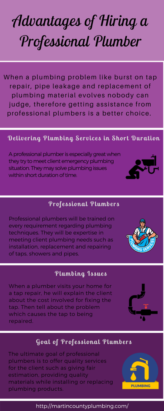 Plumbing is important for all homes, buildings and other properties. The plumbing problems like burst on tap repairs, leakages in pipes, replacement of plumbing materials when it evolves house owner may not know. To get professional services from plumbers it is important hire the right plumbers who meet customer needs. Professional plumbers will deliver quality service for clients. They have the ability to handle all big and small plumbing issues. They offer guarantee services on meeting client plumbing problems at low cost. Professional plumber may check for the entire system of plumbing repairs and also gives complete deliverance in solving the problem and will assure that any mishap regarding plumbing won’t happen in future. For more details, visit http://martincountyplumbing.com/