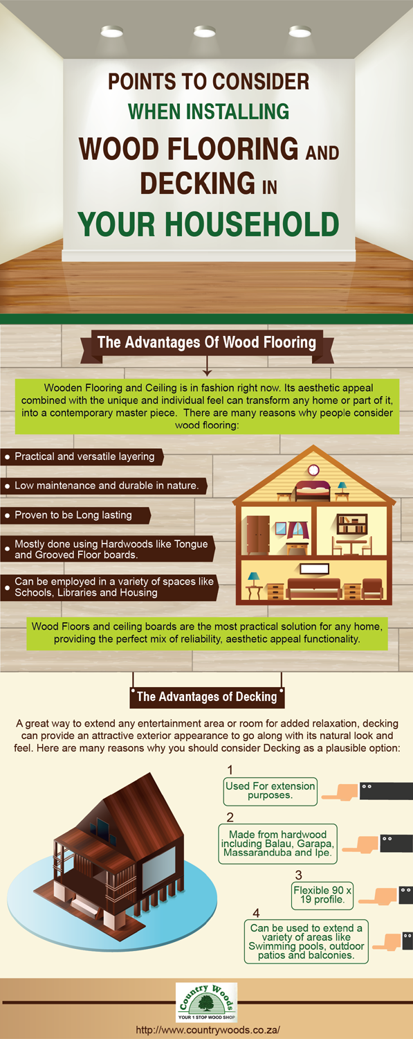 Wood flooring and decking have become a popular fashion in metropolitan houses. Wood flooring is also seen in libraries and schools. Wood flooring and ceiling can convert a simple house into a work of art. Decking is the perfect way of extending the entertainment area in short spaces. It also enhances the outlook of the house. Decking is also used for extending outdoor patios, balconies and swimming pools. There are numerous advantages of using wood for flooring and decking. These are for practical uses. The texture of the wood gives a different look and feeling to the house. Moreover the base material is durable and does not require high maintenance. Hardwoods like Grooved Floor boards and Tongue are used for flooring. Hardwoods such as Garapa, Balau, Ipe and Massaranduba are used for construction of decking. Wood decking is also flexible. For more information visit the website of The Country Woods: http://www.countrywoods.co.za/