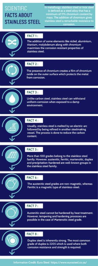 Stainless steel is a steel alloy which has 11% chromium content. There are many interesting facts related to stainless steel. When a few elements like titanium, aluminium or nickel are added to stainless steel, it increases its corrosion resistance properties. Chromium creates an oxide film on the outer surface of stainless steel. This film is what gives stainless steel its corrosion resistant properties. The austenitic steel grades are usually non-magnetic. Ferritic is a magnetic type of stainless steel. Stainless steel is generally available in more than 100 grades and each grade has a specific purpose or application. For more scientific facts, please check out the infographic at http://eurosteel.co.za/