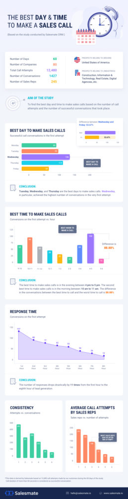 Salesmate conducted a study where we analyzed 80 companies varying across industries like Construction, Information & Technology, Real Estate, Digital Agencies, etc. In this study, we observed 12,480 call attempts spanned across 60 days (12 weeks with 5 working days). The calls were made by a total of 245 sales reps and the successful conversations were 1427. The aim of this study was to find out the best day and time to make a sales call.