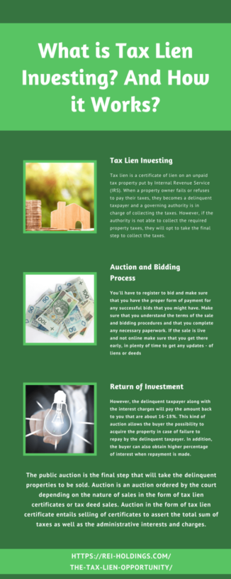Tax lien is a certificate of lien on an unpaid tax property put by Internal Revenue Service (IRS). When a property owner fails or refuses to pay their taxes, they becomes a delinquent taxpayer and a governing authority is in charge of collecting the taxes. However, if the authority is not able to collect the required property taxes, they will opt to take the final step to collect the taxes. The public auction is the final step that will take the delinquent properties to be sold.