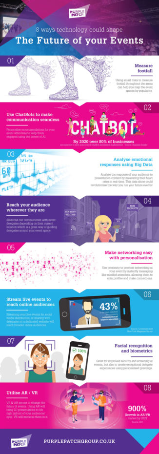 This infographic compiles some of the most exciting technologies and how they could shape the future of event technology. Countless event companies across the globe, have been utilising several of these to get great results while some of them are simply there for inspiration.