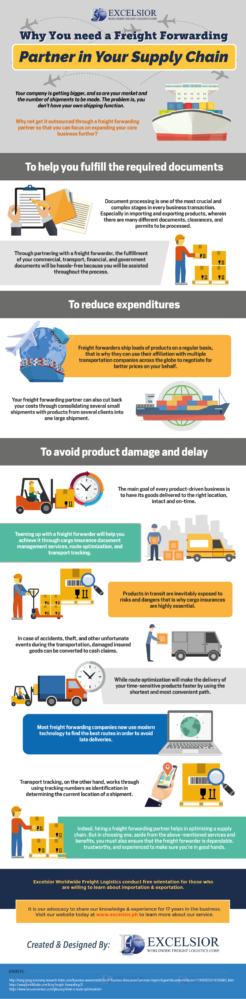 These firms specialize in arranging the storage and shipping of products on behalf of their clients which can benefit those new to international trading. This infographic by Excelsior lists several reasons why you need to partner up with a freight forwarding firm.