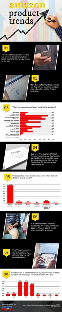 What is the purpose of Amazon product trends? This report shows how online shoppers buy products on the site, what they prefer to shop and the manner to which they find these items from the wide list of products.