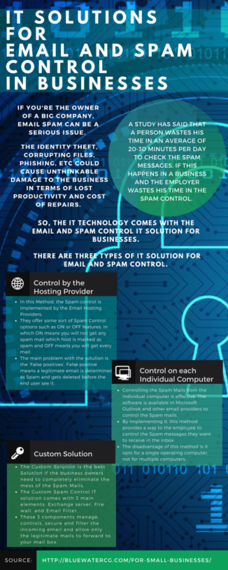 Email marketing and email answering play significant role in the Business. It is a way of providing the growth of the businesses through emails. But the inbox of the mail is always likely to flood with spam messages, with unnecessary and perilous files. If you’re the owner of a big company, this can be a serious issue. The identity theft, corrupting files, phishing, etc could cause unthinkable damage to the business in terms of lost productivity and cost of repairs. So, The IT technology comes with the Email and Spam Control IT solution for Businesses. To know more, visit http://bluewatercg.com/for-small-businesses/