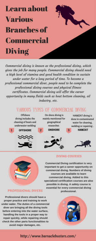 Commercial diving is known as the professional diving, which gives the job for many people. Commercial diving should need a high level of stamina and good health condition to sustain under water for a long period of time. To become a professional commercial diver, people need to be complete the professional diving courses and physical fitness certificates. Commercial diving will offer the career opportunity in many fields such as boat bottom cleaning, oil industry, underwater welding, construction, etc. Commercial diving is one of the toughest professions, which is only possible by an appropriate training and practice. For more information, visit http://www.barnaclebusters.com/