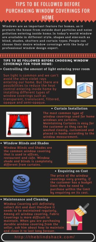 Windows are an important feature for homes, as it protects the house from outside dust particles and noise pollution entering inside home. In today’s world window are available in different style, shapes and size. Installing Windows alone does not bring any aesthetic feel for your home. But in addition it is advisable to install window coverings for type of window you have in your home. Window coverings are available in different forms such as blind, shades, shutters and curtain types. People can choose their desire window coverings with the help of professional window design expert. For more details about durable window coverings, visit http://theblindshack.com/