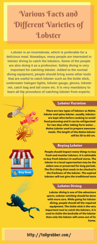 Lobster is an invertebrate, which is preferable for a delicious meal. Nowadays, many people are interested in lobster diving to catch the lobsters. Some of the people are also doing it as a profession. Safety diving is very important for catching lobster. Added to the normal diving equipment, people should bring some other tools that are useful to catch lobster such as the tickle stick, underwater halogen lights, lobster gauge, gloves, lobster net, catch bag and tail snare etc. It is very mandatory to learn all the procedure of catching lobster from experts. For more information, visit http://tailgrabber.com/