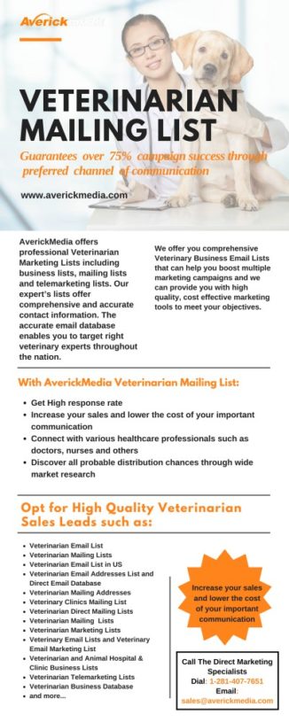 AverickMedia offers professional Veterinarian Marketing Lists including business lists, mailing lists and telemarketing lists. Our expert’s lists offer comprehensive and accurate contact information