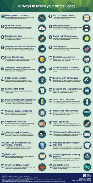 Ever wondered how far you can go to help the environment? You’ve probably had a few ideas about steps you can take to reduce waste and energy consumption in your daily life. FreeOfficeFinder.com have put together a ‘mega’ list showing 30 ways you can ‘green your office’. Not only will this help make a positive impact for the environment, it can also bring colleagues together to work towards a goal outside of their normal, daily responsibilities. Following these steps will inevitably cut costs by reducing waste and power consumption in your office space. The options listed are very accessible and easy to try. Sharing the information below in itself is also a good way to help others become more environmental friendly; so if you think the list is useful, please feel free to share!