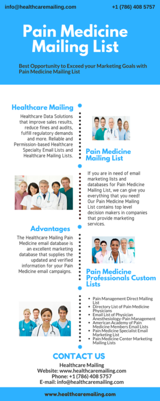 Pain Medicine Email Marketing List is updated on regular basis to ensure the highest accuracy level and tested before the final delivery.