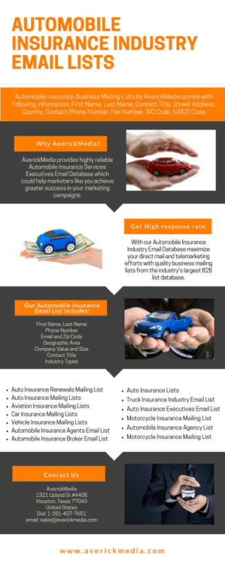 Grow your business with our unparalleled Email List of the Automobile Insurance Industry, which allows you connect with hard-to-reach decision-makers and professionals in the Insurance industry. With our Auto Insurance Executives Mailing List, the unnecessary barriers in communication process can be evaded and right prospects can be reached. Also, as each business organization has unique marketing requirements, we offer pre-packaged as well as customized Insurance Executives Database based on your campaign specific preferences.