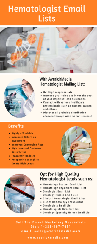 Systematically segmented and customized on request, the hematologists email list is verified, validated and global ensuring that marketers can maximize from every opportunity and expand their business beyond tried and tested domestic markets for global expansion and growth. As a medical marketer this is the time you can make a difference by systematically taking your medical offerings to hematologists that would benefit with it with our hematologist email database.