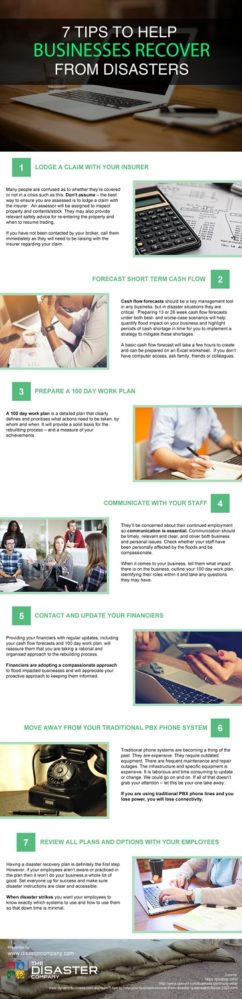 Don’t suffer after an unexpected flood strikes. Make a plan ahead of time and make sure to follow it to avoid stress and to minimize your downtime. Aside from hiring a disaster company to help you restore your business, you should make a calamity preparedness plan. Implement it right after the disaster occurs. Do not forget to include your employees in the preparation and planning of your recovery plan because they will also play a big role in your recovery process.