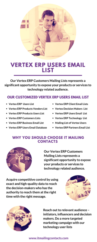 Acquire competitive control by using exact and high-quality data to reach the decision-makers who has the authority to reach them at the right time with the right message. Gain access to high value contacts of Vertex ERP Technology users and vendors.