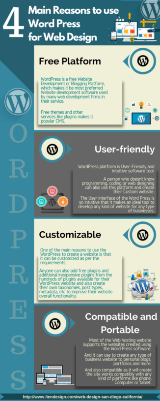 Word Press is one of the most popular Content Management Service (CMS) software to create the website. Many Web Developer and Business owners mostly prefer the WordPress Platform to create the website for their business. Because, it is free, easily customizable and have many types of advantage like it has plugins to enhance the overlook of the website, etc. Word Press has the well-established history of providing the best web development experiences to the web developers ever since the Content Management Service has been introduced. About 80% of world website is designed by WordPress Platform. Thus, it is ideal choice for most of the website developers to develop the website. To know more, visit http://www.liendesign.com/web-design-san-diego-california/