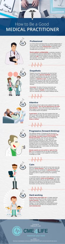 A good medical practitioner must be empathetic, calm, progressive, attentive and hardworking. They have to maintain professionalism and should always maintain patient-doctor confidentiality. Doctors must have an empathetic connection towards their patients in order to understand their pain and suffering.