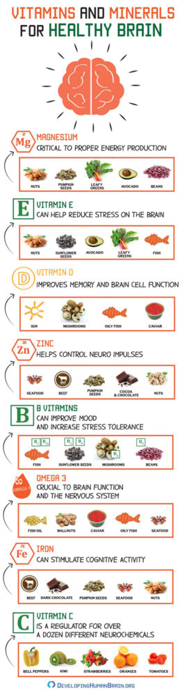 Nutrition plays a significant role in our overall health. Eating a balanced diet with lots of fresh fruits and vegetables without processed foods is the way to ensure you have a healthy brain. Memory issues, bad mood, low energy, brain fog, inability to focus will in many cases be a result of a poor diet and inadequate nutrient intake. Knowing what foods contain sufficient amounts of essential brain nutrients can make our menu planning a bit easier. The following infographic sums up 8 of the important minerals and vitamins for the brain and lists some of the popular food sources to get them from.