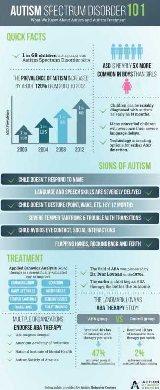 Individuals with Autism Spectrum Disorder (ASD) often have developmental delays in areas like communication, social skills, self-help skills, cognition, play skills, and motor skills. Action Behavior Centers, a center for ABA (applied behavior analysis) therapy, created an infographic with the most recent data on autism facts and statistics, signs of ASD, research findings, and information on treatment. Feel free to share and raise autism awareness. 🙂