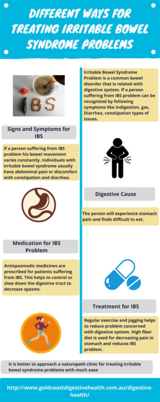 Irritable Bowel Syndrome Problem is a common bowel disorder that is related with digestive system. If a person suffering from IBS problem can be recognized by following symptoms like indigestion, gas, Diarrhea, constipation types of issues. In order to overcome IBS problem following alternative therapy is not required instead of that depending on naturopathy treatments is the best solution. Reason is alternative medication and their medicine causes side effects for Patients. For more details, visit http://www.goldcoastdigestivehealth.com.au/digestive-health/
