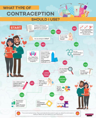 This is an educational infographic to show women that they have many different contraception methods. Many people think that condoms and the pill are all there is – that’s not true! There are plenty of options that don’t involve hormones and are much longer lasting. Follow the workflow to figure out your options. If you’re in doubt, please talk to a medical professional.