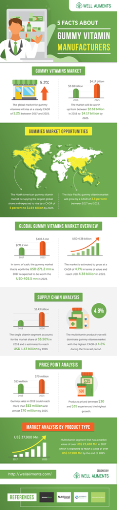 The gummy vitamins market, which as of 2017 was $271-mn, will be expected to reach around $405.5-mn by 2023. When it comes to reach and value, up to 2026 the market will grow at a rate of not less than 47-percent CAGR and reach around $4.38-billion.