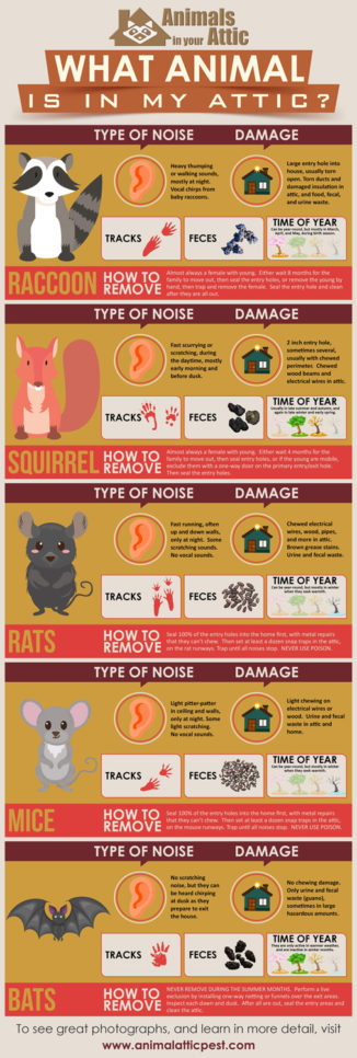 Do you hear noises in your attic? Scratching, thumping, and scurrying about? Do you want to get rid of the critters safely and effectively? Are you worried about what kind of damage the animal might cause? First you’ll need to know what kind of animal is living in your attic. Each animal is very different, and requires a different approach to removal. This guide will help you identify what kind of animal is living in your attic.