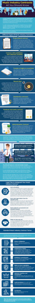 If you are in the music industry, you will end up being taken advantage of unless you protect yourself with an appropriate contract. Attorneys are expensive, and especially if you are just starting out, may not be affordable. In this infographic, you can learn the basics involved in music contracts in easy-to-understand terms for the layman. Find out what sort of contract you need, and how you can get it without hiring an attorney. Learn what these contracts do and how they can protect you. Get the definitions of key terms in these contracts so you can understand what you are signing.