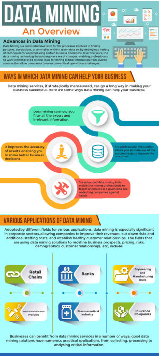 Data mining refers to a process that involves finding various patterns, anomalies, and correlations in a given dataset with the usage of innovative techniques. There are several companies around the world nowadays that offer this particular service as a part of their outsourced data entry services to larger organizations spread across the globe. Business owners rely on such companies as they offer a more professional and efficient service in comparison with the in-house data entry operators. As per the infographic of http://outsourcedataentryservices.com the process of data mining has gone through myriads of changes over the past few years. Data mining service offered by a outsourced company can be advantageous in many ways such as –a) filtering all excessive and unimportant pool of data, b) improving accuracy and eventually leading to judicious business decisions, c) improving outcomes with professional intervention, d) detecting anomalies by advanced data mining pools and taking care of them, and many more. Because of these advantages, the process of data mining is used for numerous applications in various professional sectors like banks, retail chains, engineering and manufacturing units, pharmaceutical companies, insurance agencies, and many more.