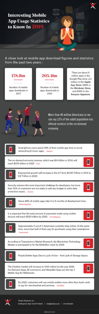 The demand for mobility solutions is continuously increasing. Businesses are looking up for the latest and innovative mobility solutions to enhance the life and business, altogether. Here are the most interesting Mobile app Market Statistics for 2019 you might be curious to know about. Find info graph at https://www.techtic.com/blog/10-mobile-app-development-trends-to-watch-out-for-in-2019