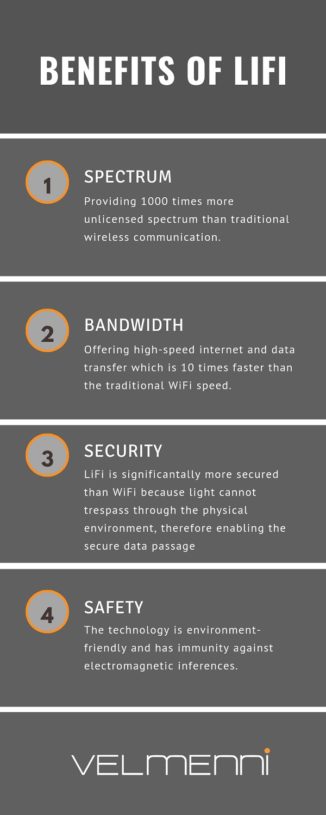 LiFi, also known as light fidelity, is a full duplex communication network enabling transmittal of data. The potency of bidirectional Visible Light Communication allows us to build an ideal medium, independent of congested radio frequencies and interference from electromagnetic waves, thus, resulting in faster data transfer.