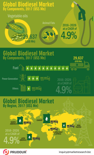 The global biodiesel market was valued at US$ 33,748.2 Mn in 2016, and is projected to register CAGR of over 4% from 2017 to 2026. The vegetable oil segment in the global biodiesel market is estimated to account for majority revenue share of 84.6% by end of five years.