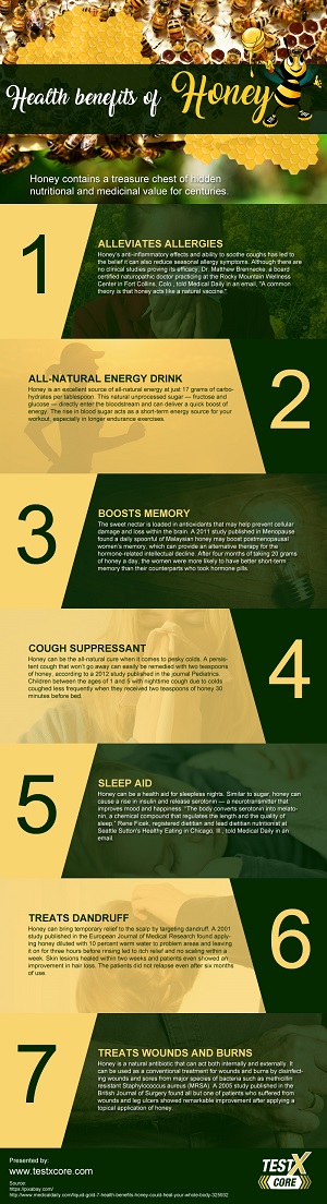 Did you know that honey is loaded with essential vitamins and nutrients? Even more surprising is that, it’s has been used as a kitchen staple since the early ages of Egyptian tombs. It seems that there is more to this golden liquid which we probably don’t know. Here’s an infographic presented by TestX Core. It features the health benefits of honey.