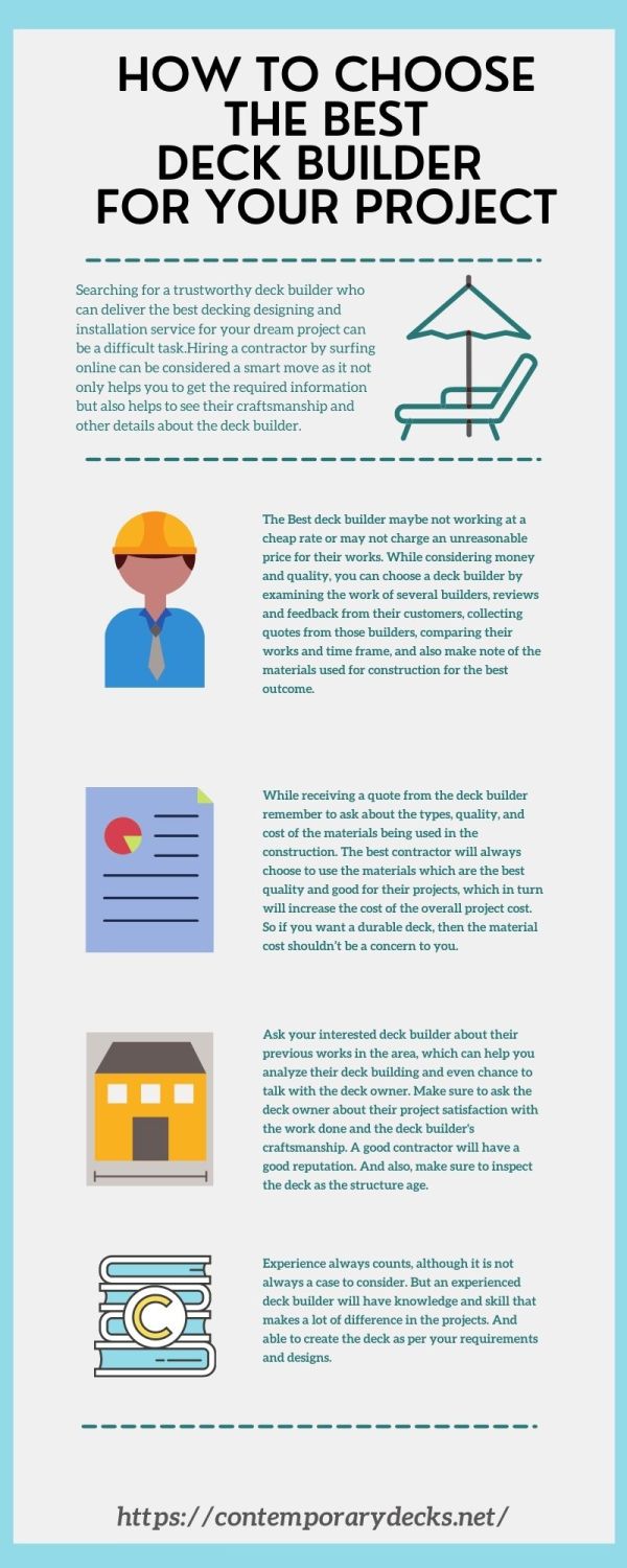 Searching for a trustworthy deck builder who can deliver the best decking designing and installation service for your dream project can be a difficult task. Going through that local contractor list or phone book doesn’t help you. Hiring a contractor by surfing online can be considered a smart move as it not only helps you to get the required information but also helps to see their craftsmanship and other details about the deck builder. So take your time and consider yourself to search through the internet. For more details, visit https://contemporarydecks.net/