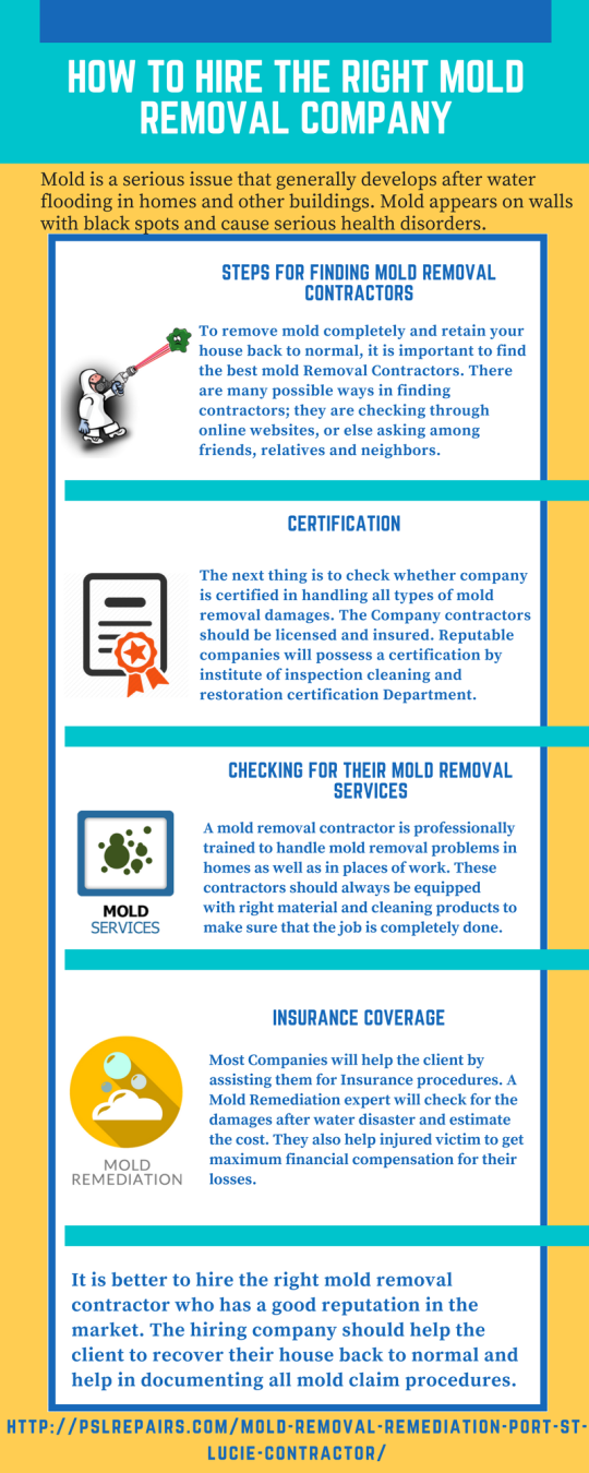 Mold is a serious issue that generally develops after water flooding in homes and other buildings. Mold appears on walls with black spots and cause serious health disorders. In that way respiratory way problem is one form caused by mold which is considered to be more dangerous. It not only impacts the health of your family but also your house. It depletes aesthetic of your house and may even damage your costly furniture. It is important to remove the mold as soon as possible with help of professional mold remediation experts. Before hiring a mold removal company just check whether, that the contractor of the company is licensed and having years of experience in this field. For More details, about hiring right mold Removal Company, visit http://pslrepairs.com/mold-removal-remediation-port-st-lucie-contractor/