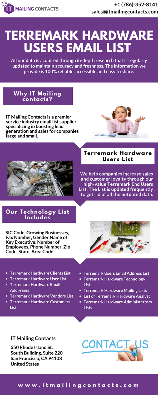 IT Mailing Contacts provides hundreds of companies with comprehensive, updated & verified details of key management professionals including top-rank executives and business professionals who hold the authority to take purchase decisions. We can help you reach Terremark Hardware Marketing Lists and Terremark Hardware Email and Mailing List.