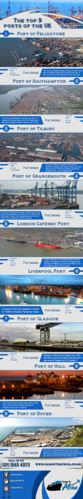 UK is one of the most progressive country of the planet earth and is amongst the most famous business hubs. That’s why people take interest to travel to UK for growth. However, being residents of some other country like Africa, they also use to send different items through cargo service providers via sea cargo or air cargo. In UK, there are major and famous 9 ports through which it sends cargo items all across the globe with full efficiency. No matter, if you want door to door cargo service, door to port or port to port cargo service, you can send your cargo items easily. This infographic is a clear view of all the major 9 ports in UK with the capacity of their loading. From the port of Felixstowe to the Port of Dover, you will find the best service to send your cargo in fast and safe manners.