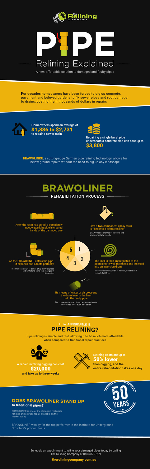 For decades homeowners have been forced to dig up concrete, pavement and beloved gardens to fix sewer pipes and root damage to drains, costing them thousands of dollars in repairs. On average homeowners spend $1,386-$2,731 to repair their sewer drains. Just to repair a burst pipe under a concrete slab can cost up to $3,800 dollars. This infographic explains a new process called “Pipe Relining” which not only cuts down the stress, time & effort it takes digging up the yard, but also provides a long term solution that’s effective and much more affordable to fix burst and broken pipes. Discover the “Brawoliner” Rehabilitation Process, which in 5 simple steps fixes burst pipes without digging and in half the time it would usually take to fix burst pipes. Best part the whole process costs less than 50% of traditional methods to fix broken pipes.
