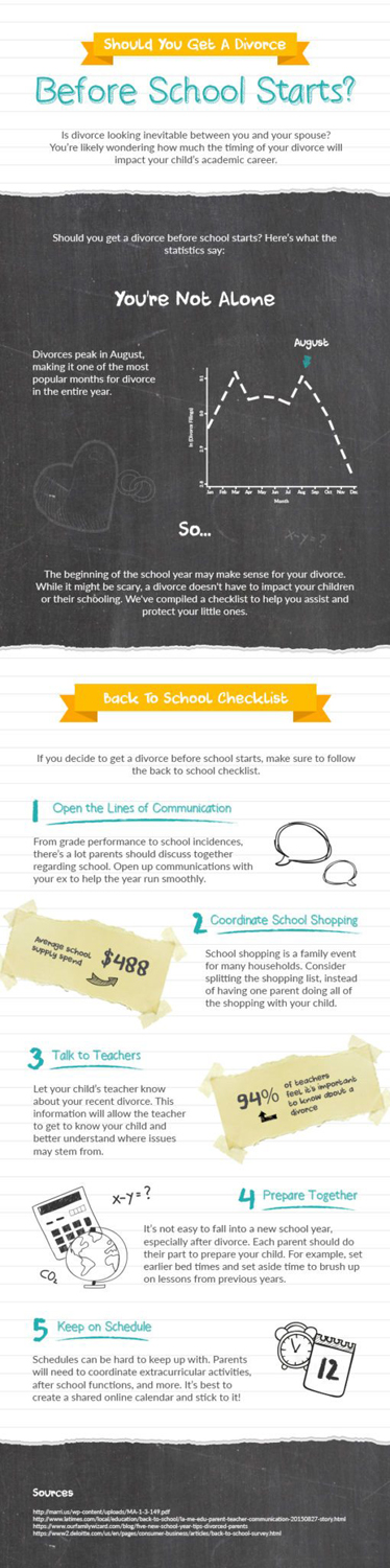 Should You Get a Divorce Before School Starts? An infographic provided by Schultz & Associates to help you assist and protect your little ones during a divorce and back to school.