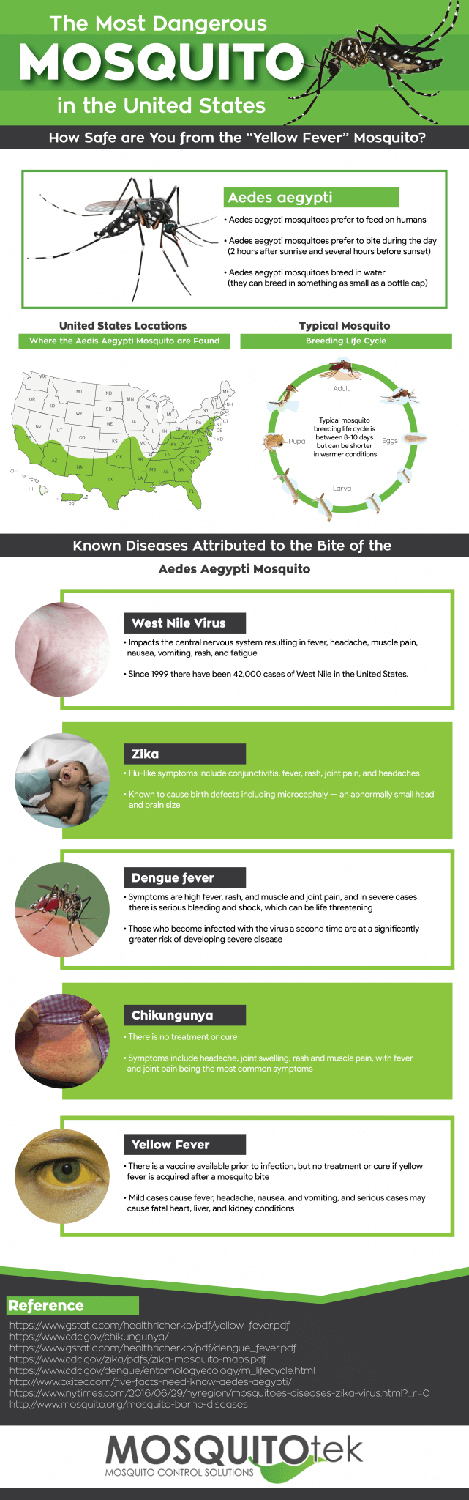 The most dangerous mosquito in the United States is the aedes aegypti, also known as the “Yellow Fever Mosquito” due to it’s link to Yellow Fever. The aedes aegypti is also the known carrier for other diseases such as Zika, West Nile Virus, Dengue fever, and Chikungunya. The aedis aegypti mosquito has high populations throughout the southern United States and is responsible for some of the most dangerous diseases in the world.