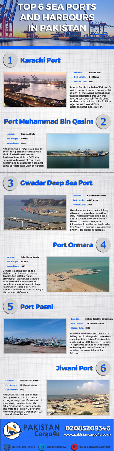 Geographically, South Asia is the most important place on the planet earth regarding the sea cargo business. It is gifted with some of the most significant sea ports. Amongst them, Pakistan is the country with the best of the best sea ports of this region. Mainly, the Gwadar port in the future of prosperous business and industry not only for Pakistan, but also for all the other countries which are going to connect with it. There are total of six sea ports in Pakistan. This infographic is a clear view that defines the geographical structure, capacity and the importance of these ports. As, UAE is the biggest business hub if the world, and every country is focusing to reach it. The ports of Pakistan are the most suitable to boost this business. Mainly for China and the CPEC, these ports, especially the Gwadar port, plays vital role to be the connecting part of the transfer of goods from China to the other countries. Let’s have a detailed look on the dimensions of all the six sea ports of Pakistan.