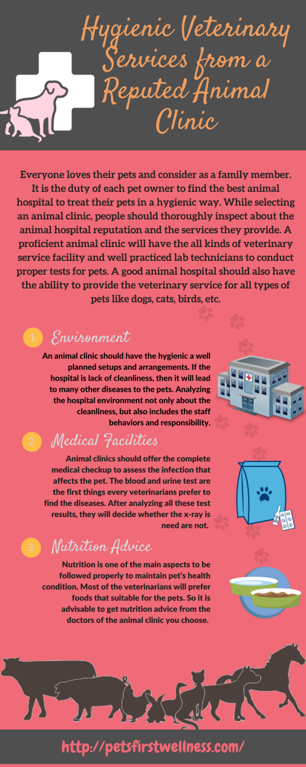 Everyone loves their pets and consider as a family member. It is the duty of each pet owner to find the best animal hospital to treat their pets in a hygienic way. While selecting an animal clinic, people should thoroughly inspect about reputation of the animal hospital and the services they provide. A proficient animal clinic will have the all kinds of veterinary service facility and well practiced lab technicians to conduct proper tests for pets. A good animal hospital should also have the ability to provide the veterinary service for all types of pets like dogs, cats, birds, etc. For more information, visit http://petsfirstwellness.com/