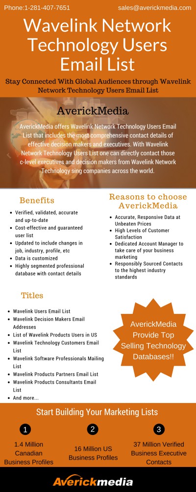 Wavelink Network Technology Users Email List- Infographics Posted on August 26, 2017 by Andrew Rayel Our Wavelink Network Technology Users email database contains the most up-to-date information on thousands of IT companies and professionals.