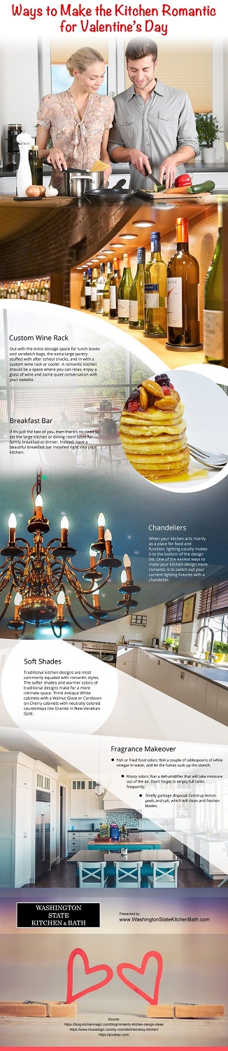 Celebrate the love month the entire time without spending much. A little bit of arranging your kitchen can make it a romantic place where you can have a date with your husband. Cooking together for a meal is a way to know more about each other and the result is an awesome food for dinner. This infographic will give you many ideas to have a valentine-ready kitchen upgrade.