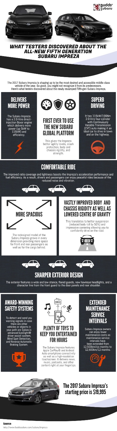 The 2017 Subaru Impreza is shaping up to be the most accessible middle class vehicle of the year. Find out what testers discovered about the All-New Fifth Generation Impreza. As the first ever to use the new Subaru Global Platform, this vehicle delivers better agility levels, crash protection, and more.