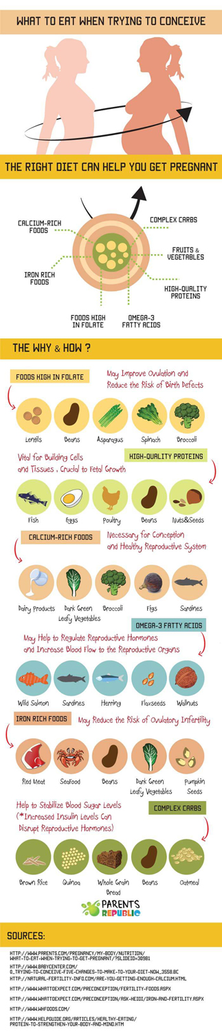 Changing your diet is a healthy way to maximize your chances of getting pregnant and helping your body support your pregnancy later on. The basic guidelines are: Eliminating simple carbs and trans fats. Eating more complex carbs and foods rich in essential vitamins and minerals. Eating healthy will help you become healthier and as a result more fertile. The following infographic gives an example of foods that may positively affect your fertility.