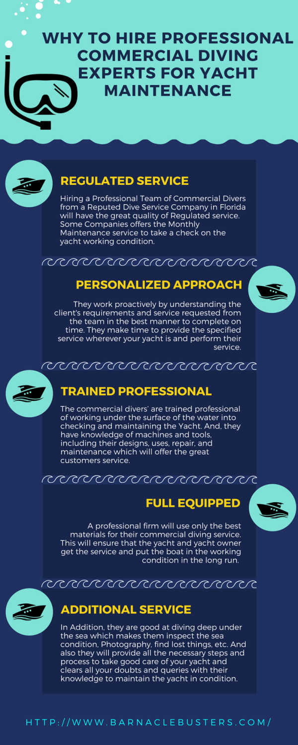 Maintenance of a Yacht is necessary to keep it in working stage and use it at any time. A person without the knowledge of the yacht can’t service the yacht. It professional intervention to clean, repair and maintain the vessel, hull and other parts of the immersed parts of the boat. Only a professional can help in maintaining a yacht in good condition. If you want to Clean, inspect or maintain your boat, then consulting or hiring a Professional Commercial Diving Experts for your dive service will be very helpful. To know more, visit http://www.barnaclebusters.com/